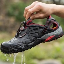 La couche extérieure des chaussures de randonnée en été est représentée par des textiles polymères ou du cuir traités avec des imprégnations protectrices. Se déplacer dans des chaussures en cuir est assez confortable, mais lorsqu'elles sont mouillées, ces chaussures sèchent beaucoup plus longtemps.
