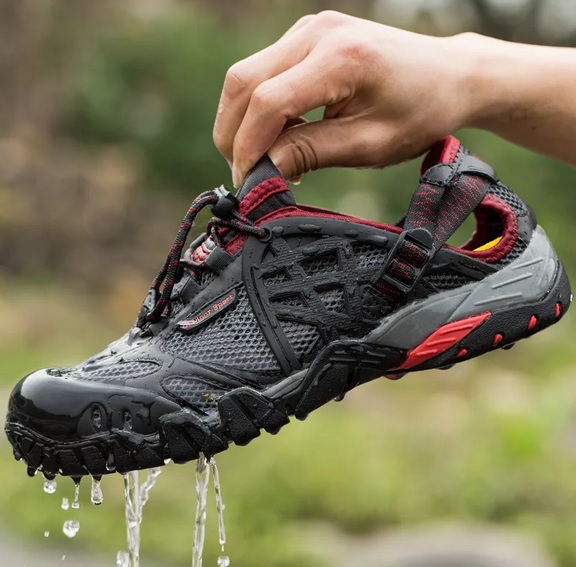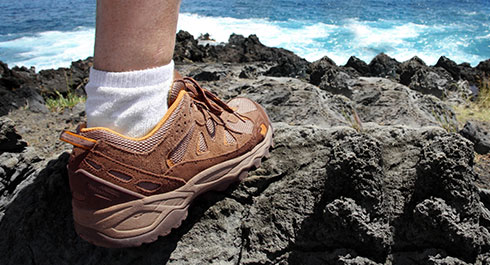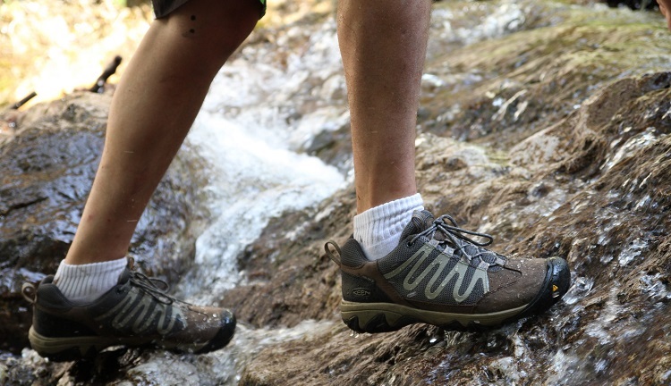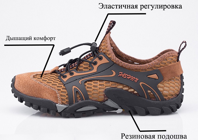 Les baskets ordinaires ne conviennent pas ici, le choix est préférable en faveur de chaussures de trekking légères, même si vous marcherez par temps chaud. Contrairement aux baskets, les bottes assurent une fixation efficace du pied, protègent la cheville des entorses et des égratignures. De plus, les pieds dans de telles chaussures sont protégés des infiltrations d'eau par le dessus, le sable, la saleté et les insectes désagréables ne pénètrent pas dans la peau.