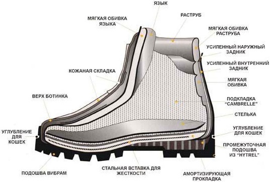 Les chaussures d'alpinisme sont les plus difficiles. Il présente une haute élasticité et une semelle extérieure multicouche, souvent complétée par des renforts en acier. A l'avant et à l'arrière, il y a des supports spéciaux pour les "crampons" et des machines pour les skis. Ces chaussures ont une couche isolante, ainsi qu'une protection spéciale contre l'humidité et la pénétration de la neige.