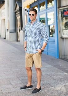 Tenue à la mode - short allongé et chemise en lait à manches longues - idéal pour aller à une exposition ou à une cafétéria. Assurez-vous de prendre des chaussures bateau marron clair pour compléter ce look.