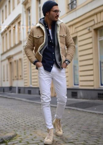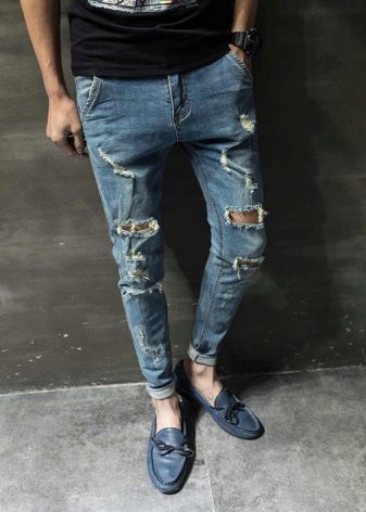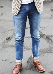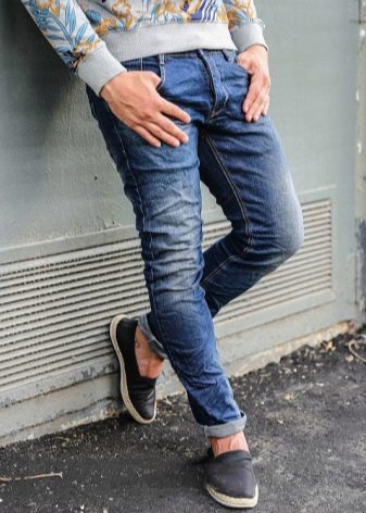 - Étroit. Les jeans skinny existent également en plusieurs variétés, les plus courantes étant les cigarettes et les jeans skinny. Ce pantalon convient aux hommes grands et minces. Les cigarettes sont principalement portées avec des chaussures classiques ou des chaussures de sport. Parmi les favoris figurent les topsiders, les mocassins, les moines. Le skinny est bon en tandem avec des espadrilles, des mocassins, des chaussures hautes.