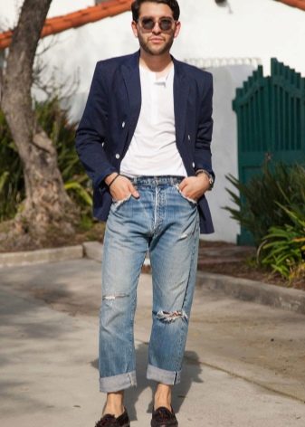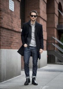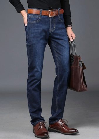 - Classique. Ce modèle devrait être dans la garde-robe de chaque homme, comme le plus polyvalent et le plus pratique. De tels jeans s'adaptent bien à toutes les silhouettes, harmonieux à l'image de tous les âges et de tous les statuts. Ils ont une coupe droite et conviennent parfaitement aux tenues décontractées. Les combinaisons avec des mocassins, des mocassins, des richelieus, des desserts, des oxfords peuvent être considérées comme particulièrement réussies. Si vous choisissez des mocassins, faites attention au décor : il ne doit pas se cacher sous la jambe, les modèles longs peuvent être repliés.