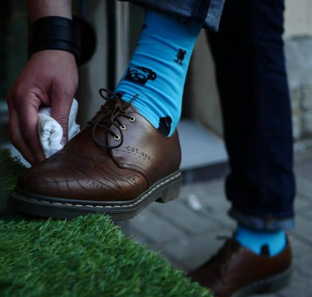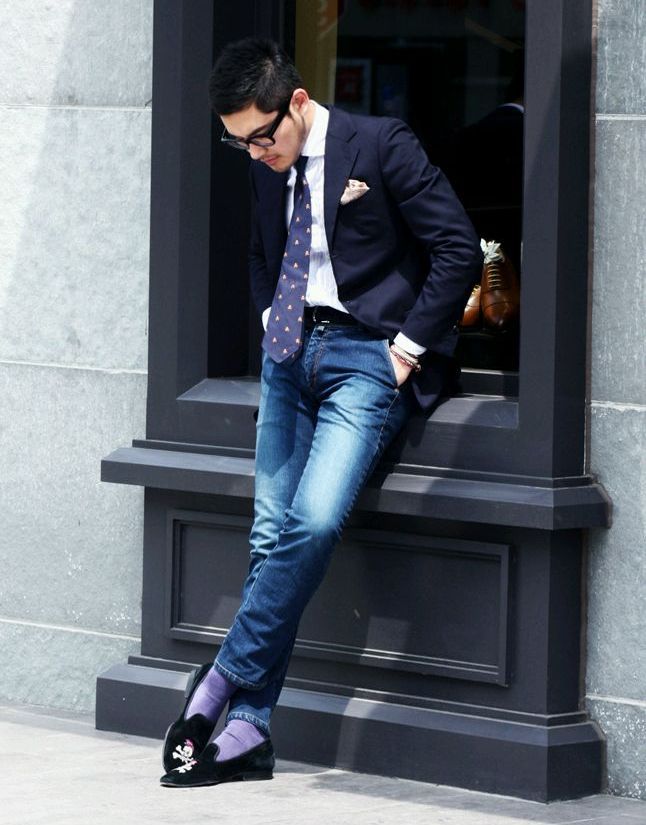 - Une combinaison de jeans droits et de chaussures classiques peut sembler ennuyeuse - ajoutez des chaussettes accrocheuses à la composition qui font écho à la teinte du vêtement.