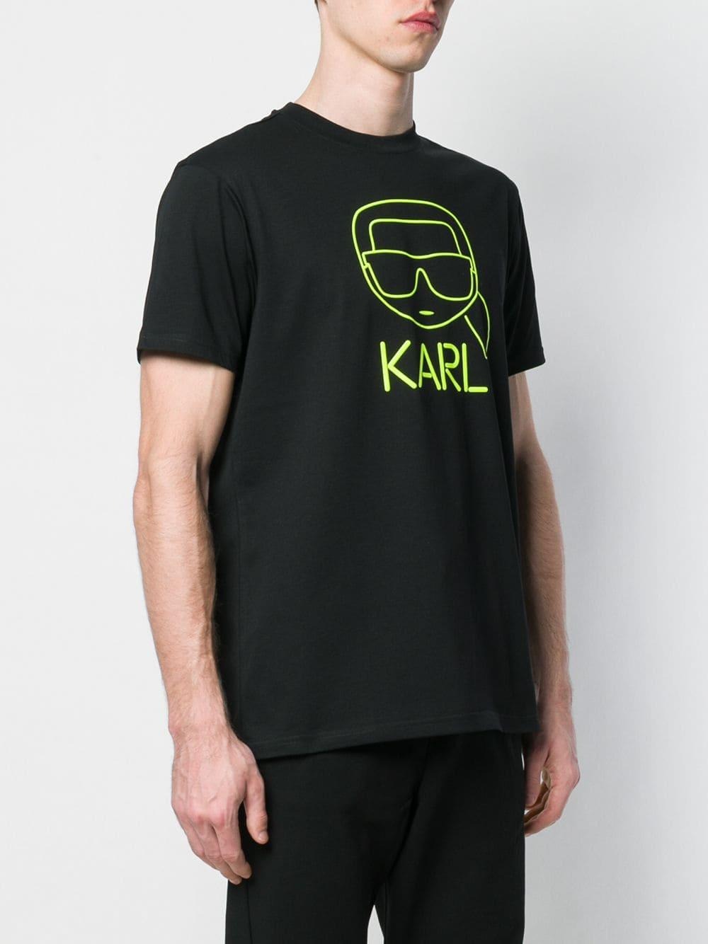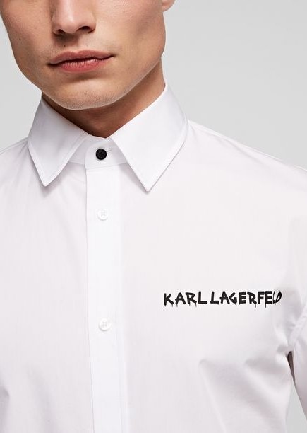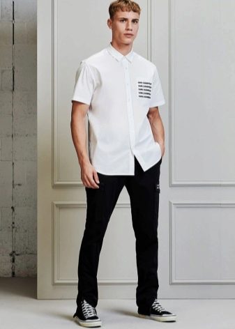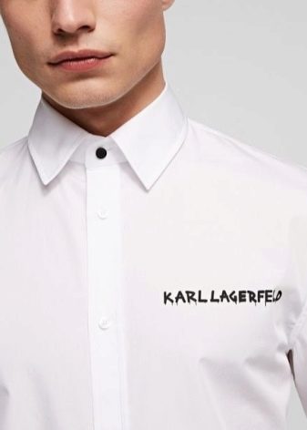 Sous une chemise en popeline blanche avec inscription Karl Graffiti, vous pouvez choisir avec succès un pantalon classique droit de l'assortiment. Vous obtiendrez non seulement un excellent arc de bureau, mais également une image pour sortir avec des amis pour le déjeuner.