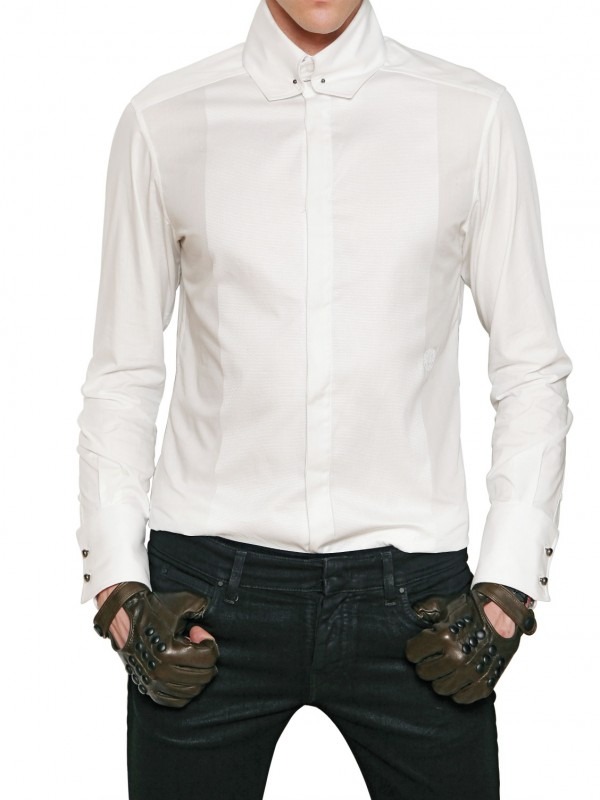 - Chemises en popeline et denim avec cols classiques et col montant. Couleurs des chemises : noir, blanc, avec petits logos.