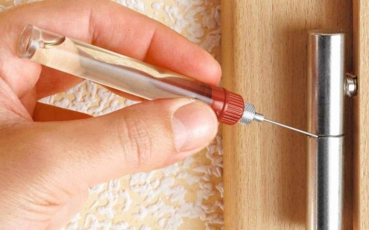 Les charnières doivent être généreusement lubrifiées avec de l'huile. Pour ce faire, de l'huile s'égoutte sur les charnières, après quoi vous devez commencer à ouvrir et à fermer la porte - de cette manière, l'imprégnation entrera dans toutes les parties de la charnière. Si cette méthode ne vous aide pas, vous pouvez utiliser un solvant. L'agent est pulvérisé sur les rideaux, après quoi des produits chimiques agressifs commencent à corroder la rouille.
