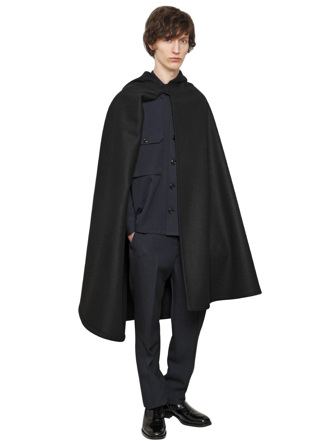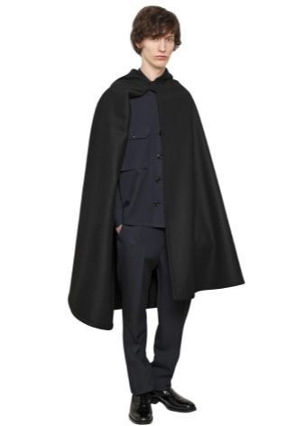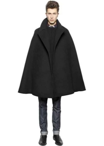 Une cape pour homme originale qui sort du lot. La cape est livrée avec un fermoir et certains produits sont simplement mis sur la tête. Pour la fabrication de vêtements d'extérieur inhabituels, du cachemire, des tissus en laine, du cuir et des tissus imperméables sont utilisés.