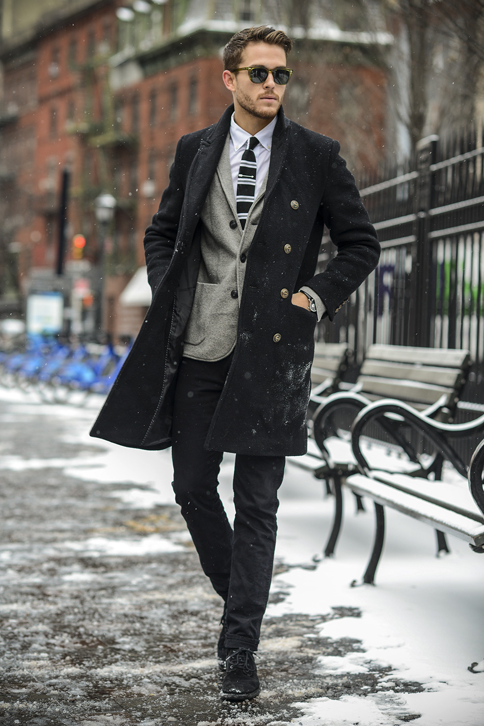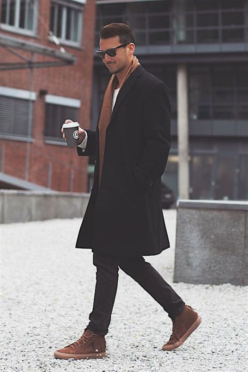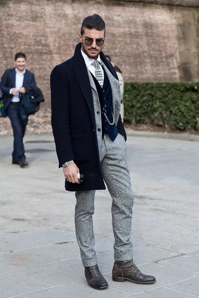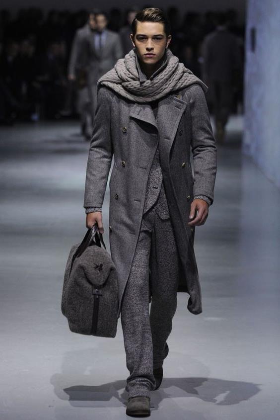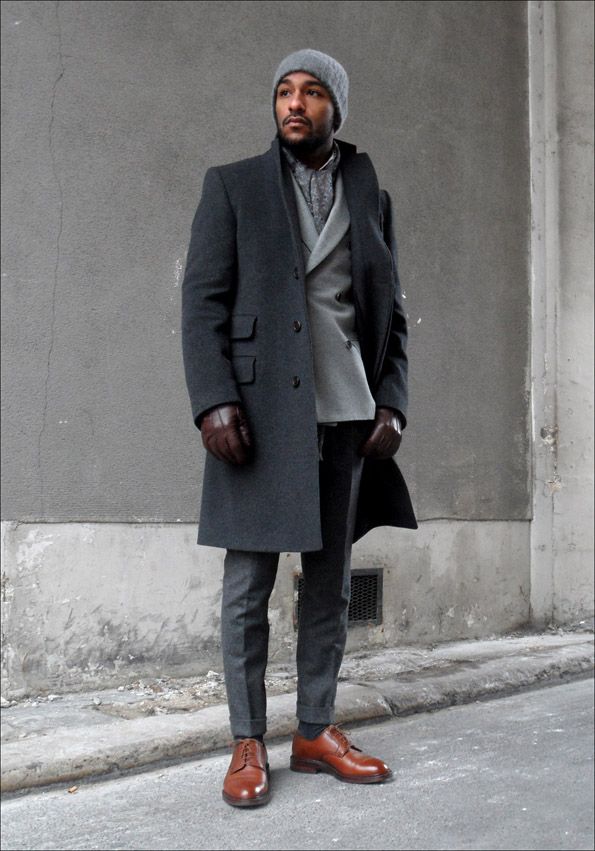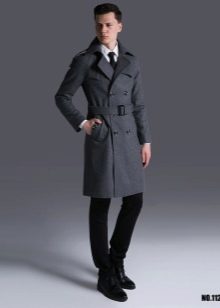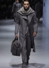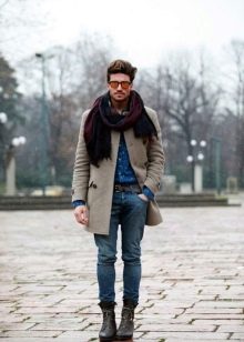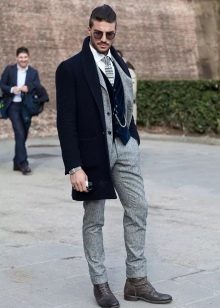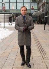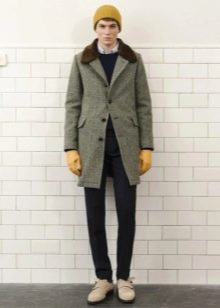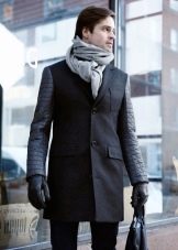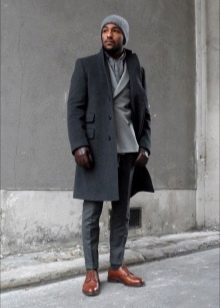 Le manteau gris n'a pas l'air si formel, mais si vous envisagez de le porter sous un costume d'affaires, il doit être allongé. Le plus souvent, ces vêtements sont complétés par des jeans à coupe étroite, des chaussures basses ou des bottines. Une écharpe ou un snood est nécessaire pour un manteau d'hiver, il protège non seulement le cou du froid, mais donne également un zeste à l'arc choisi. Le choix d'une coiffe dépend directement du style. Avec un look business, une casquette ou un chapeau conviendra; pour un look décontracté, il n'y a pas de restrictions - dans la plupart des cas, les hommes combinent un manteau avec un bonnet tricoté.