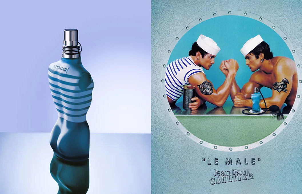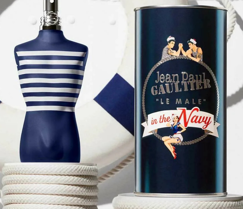 - Parfum aromatique Le Beau Male. L'eau de toilette sonne des nuances lumineuses de menthe, d'orange, de sauge, de musc et de lavande. Le flacon est réalisé dans une agréable palette de couleurs blanc et bleu, imitant un gilet marin.