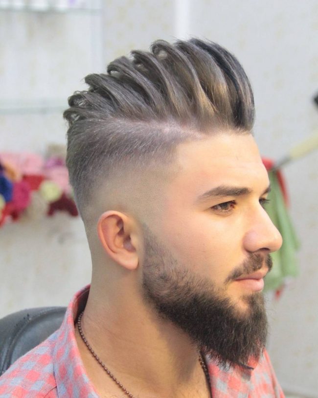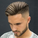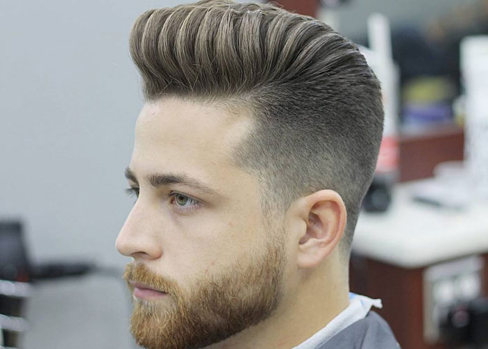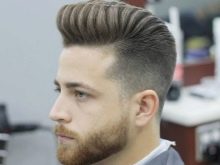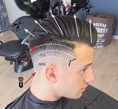 Pompadour est une coupe de cheveux assez complexe pour la performance et le style futur... Créé par cisaillement d'échelle, fuite et fixation ultérieure avec de la cire. Les franges surélevées sont idéales pour mettre en valeur les nuances de noir et de cendre.