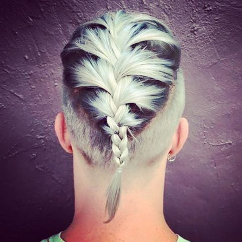 Le tissage partiel ne sera pas moins impressionnant. Pour ce faire, il suffit d'appliquer un gel tenue forte pour nettoyer les cheveux et mettre en valeur la mèche centrale. Tressez une large tresse française et fixez-la avec un élastique épais. Couvrir les cheveux avec du vernis. Pour donner de l'extravagance à l'image, rasez le reste des cheveux.