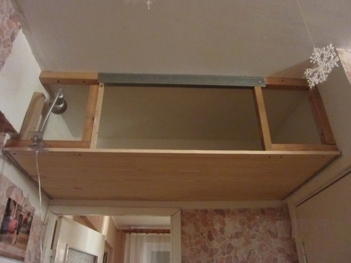 Vous pouvez fabriquer et installer une mezzanine de vos propres mains dans le couloir au-dessus de la porte en utilisant du contreplaqué comme base. Considérez des exemples de deux options lorsque ce matériau est utilisé..