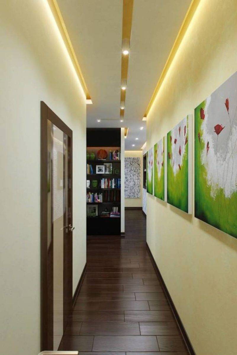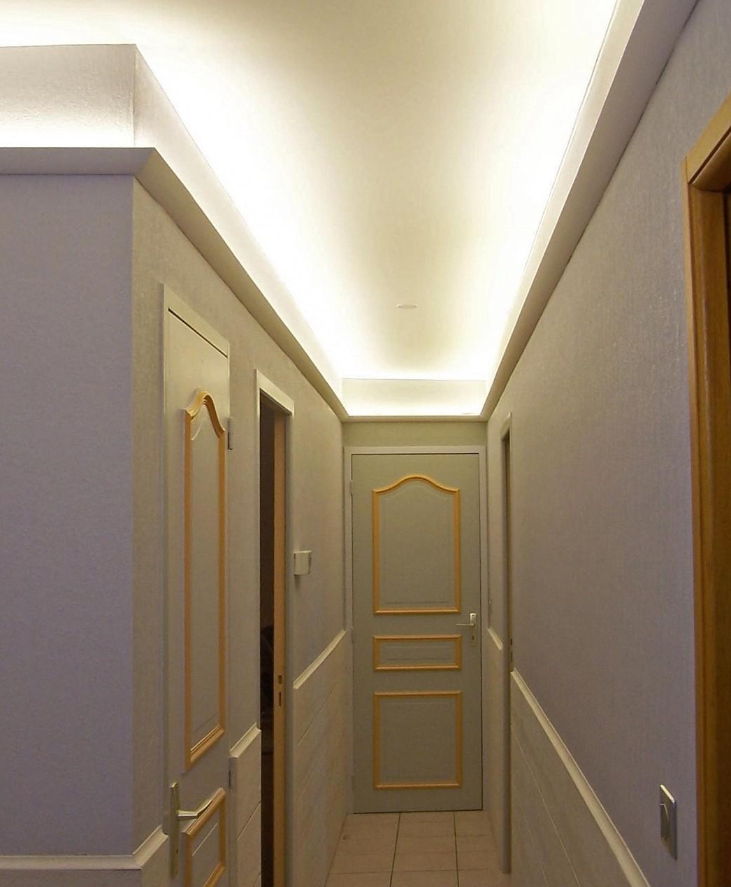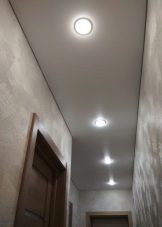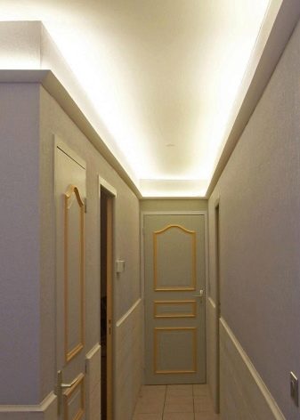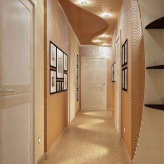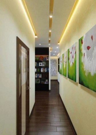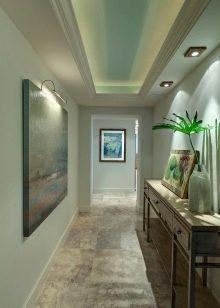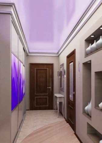Les options de tension seront un excellent moyen de décorer les plafonds. De cette façon, vous masquerez les défauts de la surface du plafond et la brillance d'un tel revêtement avec un certain effet miroir ajoutera de la profondeur à la pièce. L'utilisation de peinture à l'eau pour les plafonds, associée à des plinthes de plafond, donnera visuellement au couloir une plus grande hauteur.