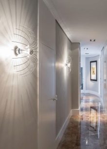 - Les appareils d'éclairage muraux, avec une lueur dirigée vers le plafond à un angle réglable, ont fière allure dans le contexte des plafonds tendus. Il y a une impression d'augmentation visuelle de la hauteur du couloir. Cette option est extrêmement avantageuse pour les couloirs étroits et les plafonds bas.