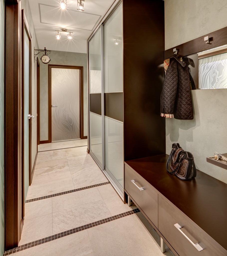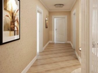 Pour créer un design à la mode et économiser de l'argent, les revêtements de sol peuvent être combinés (placez des carreaux à l'entrée et recouvrez la surface restante de stratifié). Si le revêtement de sol du couloir est placé un peu plus loin de son périmètre, en le prolongeant dans la cuisine ou dans le salon, la pièce courte deviendra visuellement plus longue.
