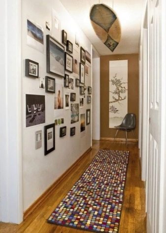 - Extérieur. Il s'agit de tapis de différentes couleurs et formes. Dans le même temps, l'attention des invités se concentrera sur le sol et ne se concentrera pas sur les dimensions du couloir.