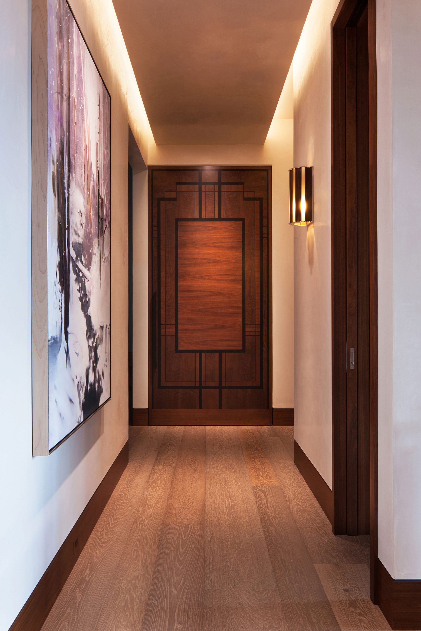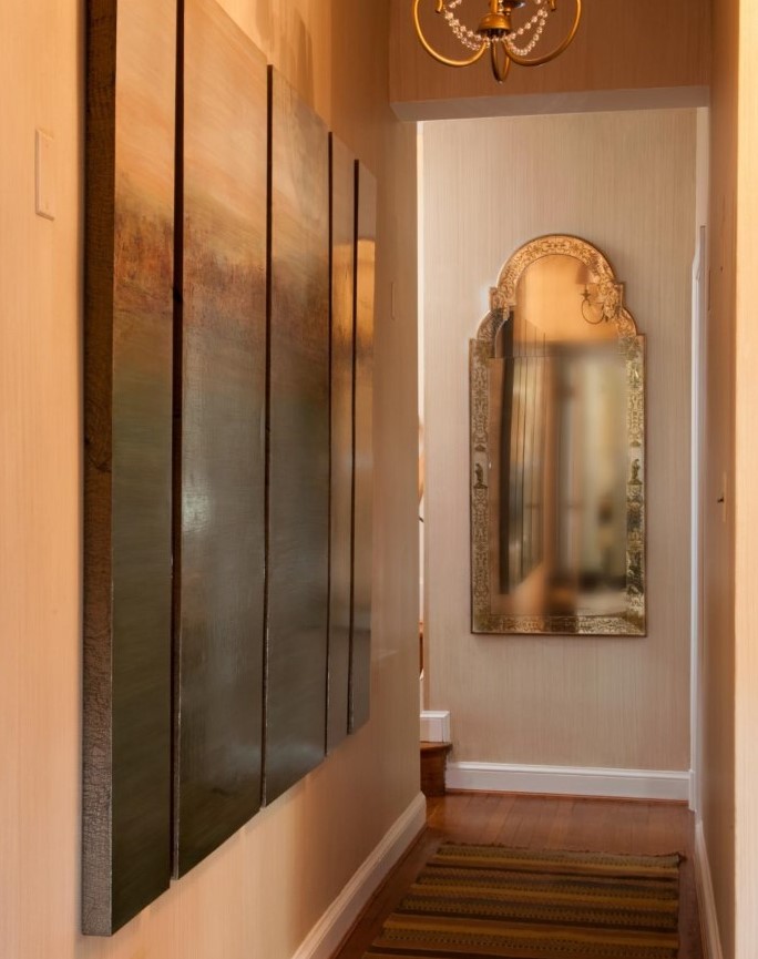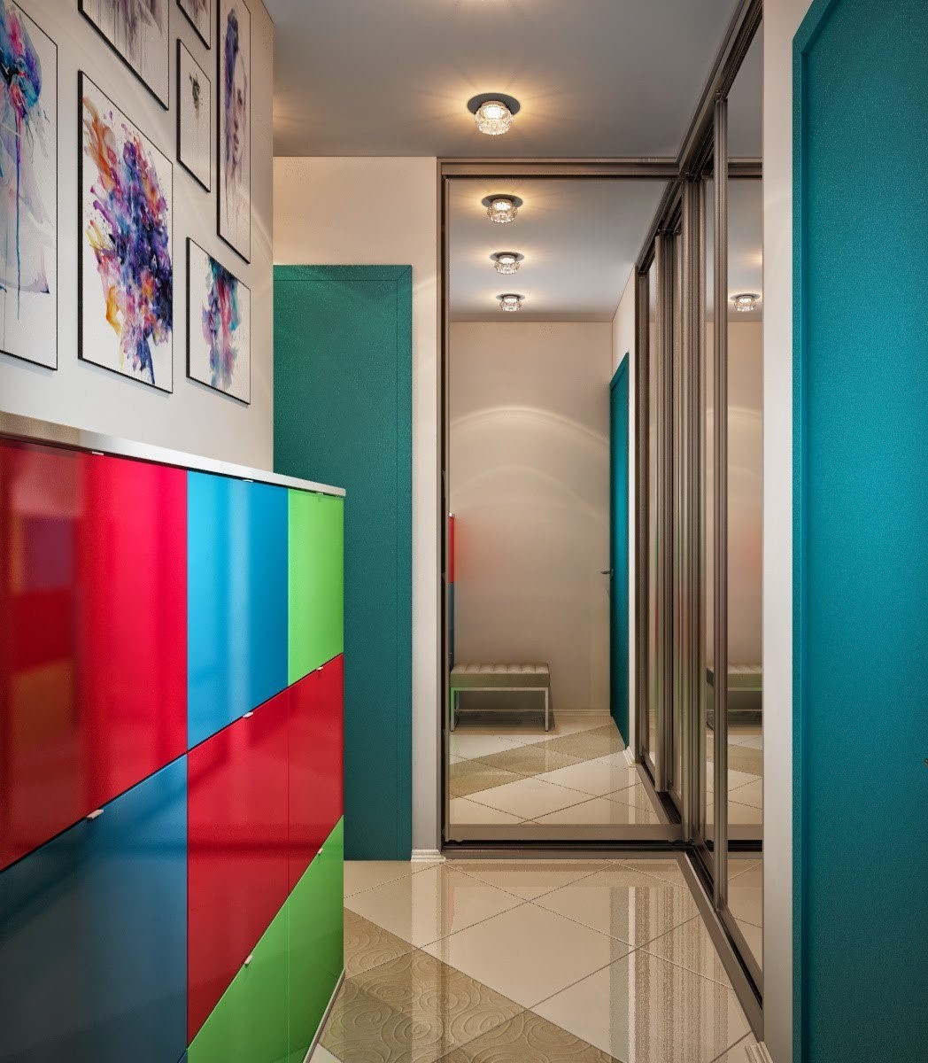 La combinaison harmonieuse de couleurs, de peintures au mur et de portes brillantes rafraîchit la perception d'un couloir étroit.