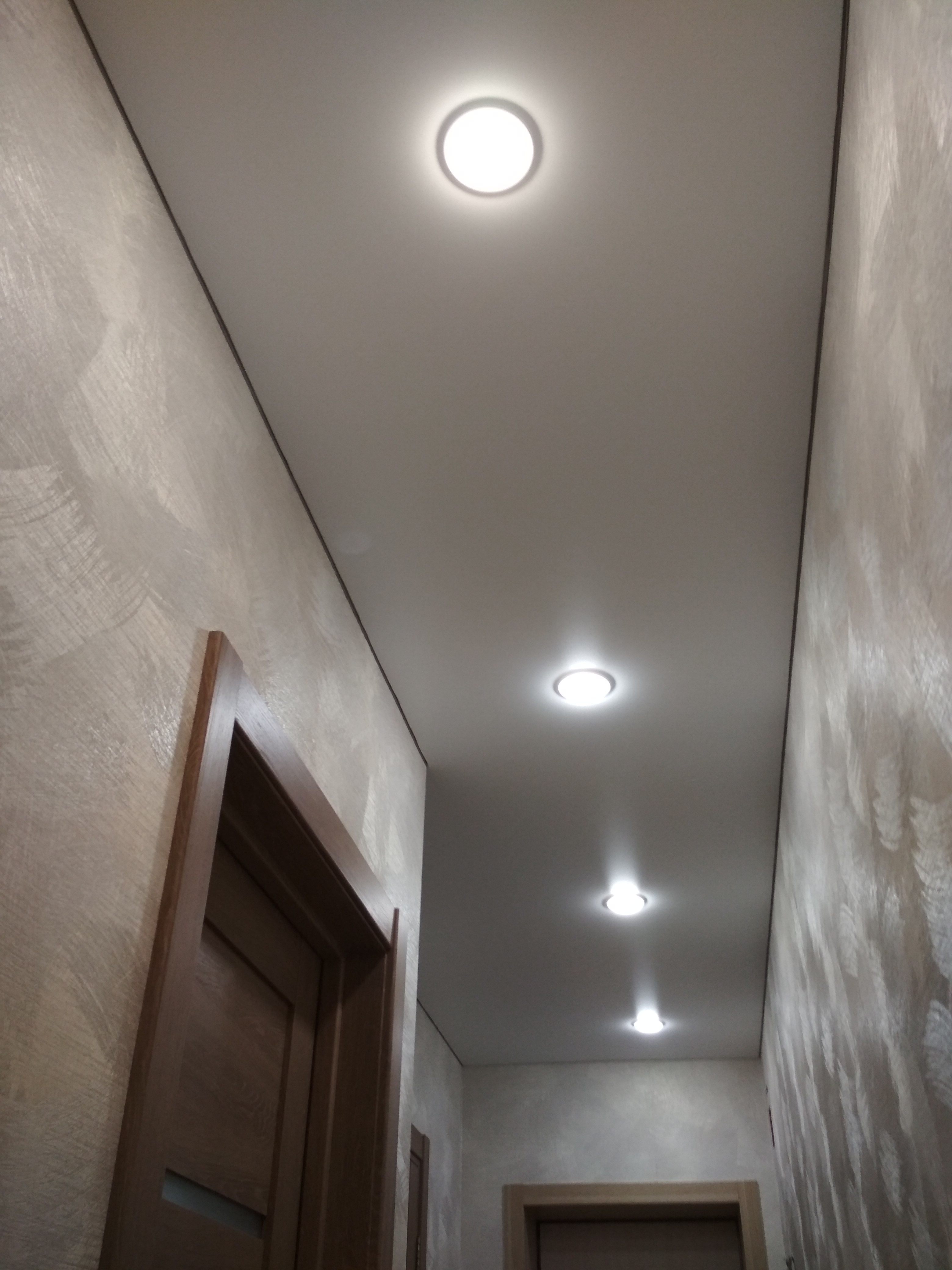 - Au moyen de spots de plafond. Cette option a fière allure dans le contexte des plafonds tendus, où ils sont facilement montés.