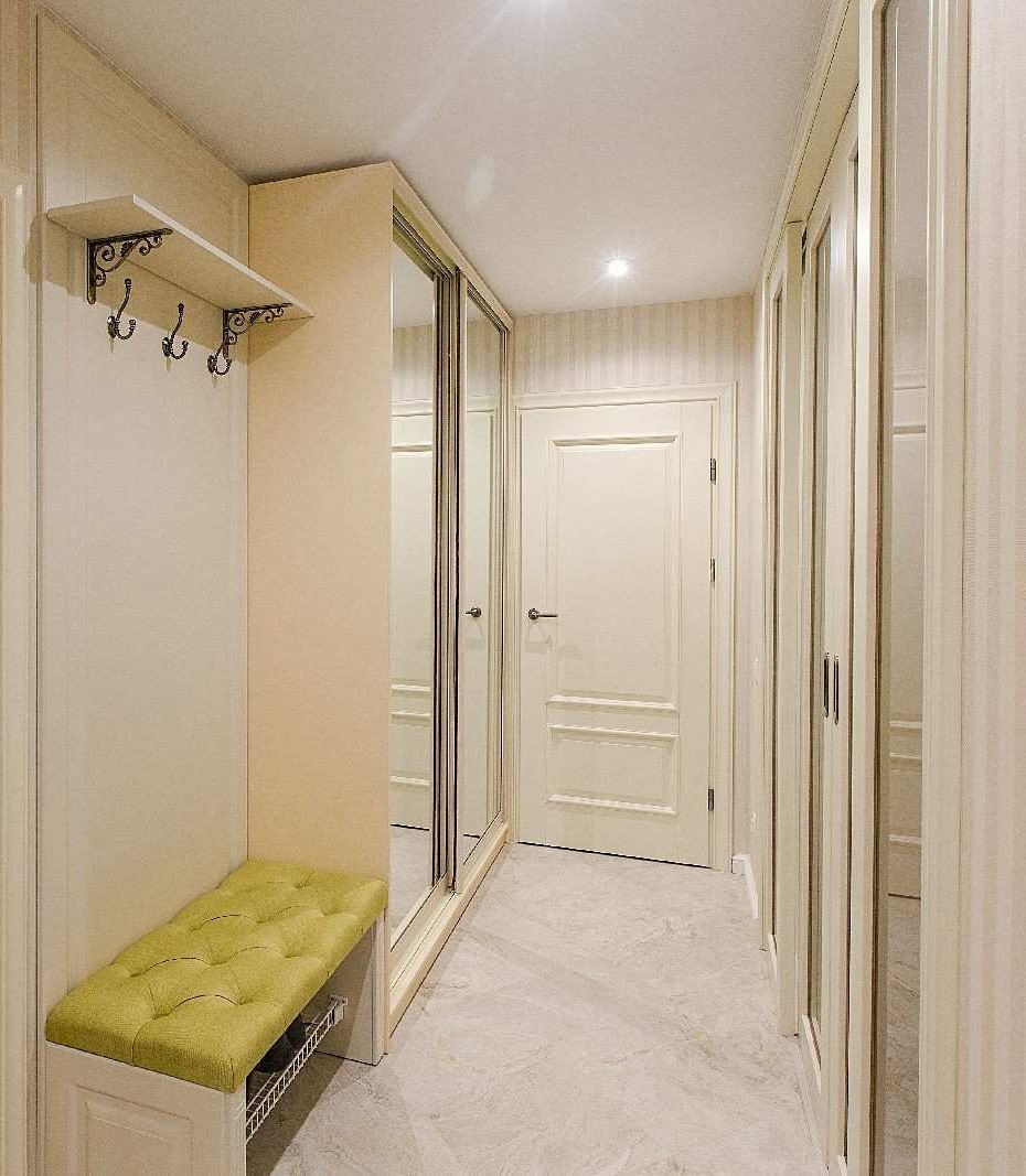La prédominance de nuances claires dans la conception, un simple cintre et un banc, des armoires étroites et un cintre décoratif au mur façonnent avec succès la perception spatiale du couloir.