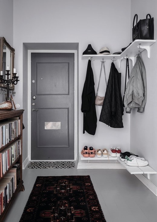 - diviser l'espace en certaines zones à l'aide de couleurs (zone chaussures, vêtements d'extérieur, enfants, adultes, etc.);