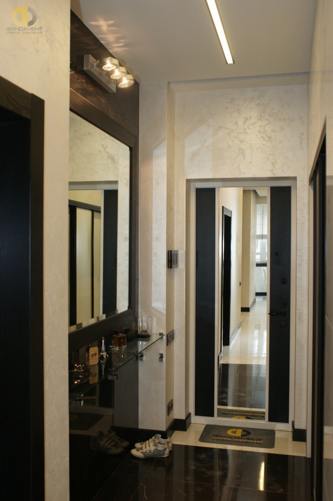 Le contraste entre les murs sombres et clairs est harmonieusement compensé par la présence de miroirs avec des lampes qui créent l'illusion d'espace.