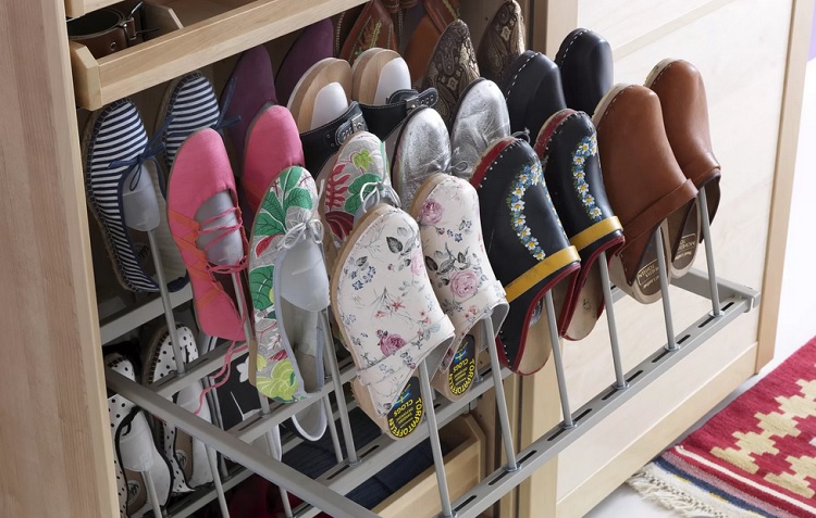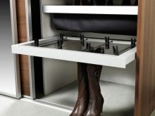 La conception coulissante est une petite armoire ouverte. Les chaussures sont simplement posées sur les étagères, qui glissent immédiatement en arrière. En règle générale, sur une étagère, les produits peuvent être placés sur plusieurs rangées (généralement sur deux rangées), ils sont également équipés de supports de talon qui vous permettent de placer les chaussures en position semi-debout. Dans un petit appartement, vous pouvez installer des systèmes de stockage cachés avec des étagères coulissantes. Les options les plus courantes sont le bas des armoires, les escaliers et autres.