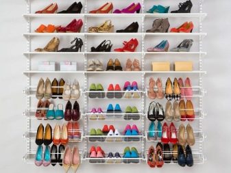 - Les amateurs de chaussures à talons sont parfaits, curieusement, grilles métalliques. Il est important de choisir une grille en métal revêtu solide. Les chaussures sont maintenues sur un tel réseau en raison du fait que le talon s'y accroche. La grille est fixée au mur. Une structure similaire peut être assemblée par vous-même en utilisant de vieux tuyaux ou des piles inutiles.