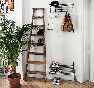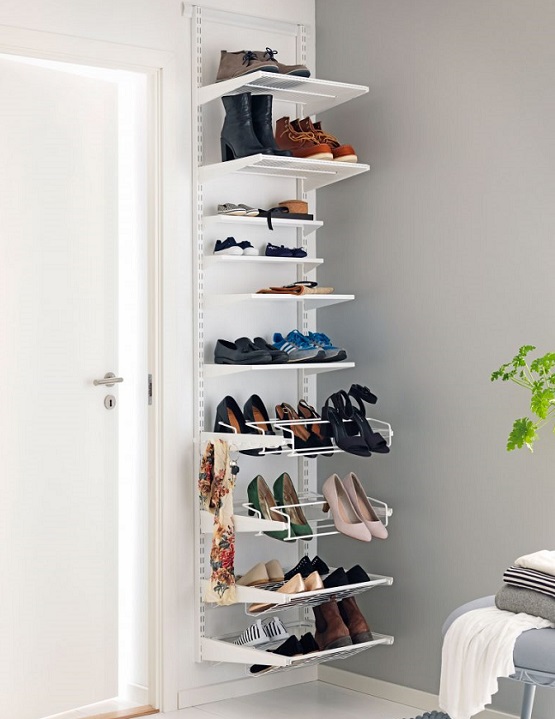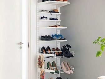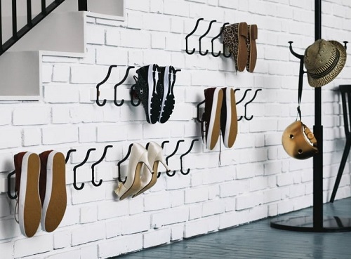 - Si vous êtes propriétaire, les étagères à chaussures peuvent être visser directement au mur. Ils libéreront de l'espace dans le couloir et auront l'air assez élégant. L'étagère la plus basse est installée pas haut du sol, les suivantes - à une petite distance égale les unes des autres.