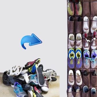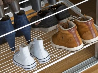 Toutes sortes d'organisateurs sont déjà devenus un moyen de prédilection pour ranger non seulement des milliers de petites choses, mais même des chaussures. Ils peuvent être soit ordinaires, avec des divisions carrées, soit ronds. Tous ont un cintre et sont accrochés à la barre transversale de l'armoire. La grille peut servir d'analogue à l'organisateur. Il est particulièrement pratique pour ranger des modèles rigides.
