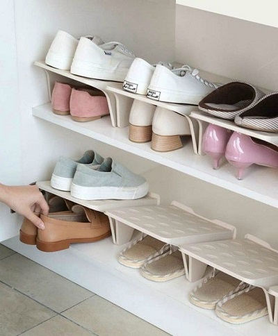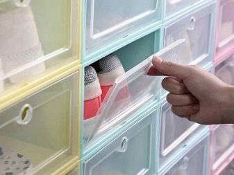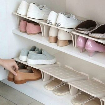 Une option de stockage inhabituelle est des organisateurs spéciaux qui ressemblent à un support en plastique pour sécher la vaisselle... Cette option de stockage ne convient pas aux chaussures d'extérieur sales. Le produit est placé dans le renfoncement avec la pointe vers le bas et stocké en position debout. De plus, des chaussures d'été légères peuvent être placées dans cet organisateur, mais elles doivent d'abord être nettoyées. Certaines des méthodes de stockage les plus simples incluent une boîte en plastique transparente.