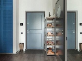 - Option pratique et moderne - une armoire à chaussures ouverte sur charnières. Cela rend le nettoyage du couloir beaucoup plus facile. Vous pouvez fixer une telle armoire le long du mur ou la positionner en travers, créant ainsi un mur artificiel supplémentaire.