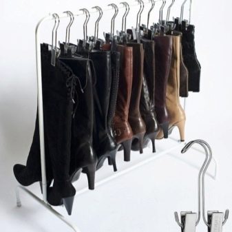 Les bottes peuvent être rangées sur des cintres... Pour ce faire, vous devez acheter des cintres spéciaux avec des clips et utiliser ces derniers pour attacher des bottes. Les bottes peuvent être suspendues, après quoi elles prendront beaucoup moins de place que lors d'un stockage normal. Un accessoire non standard sous la forme d'une fiole jaugée peut être utilisé si vous décidez de conserver une paire commémorative. Dans celui-ci, cela ressemblera à une exposition de musée à domicile.