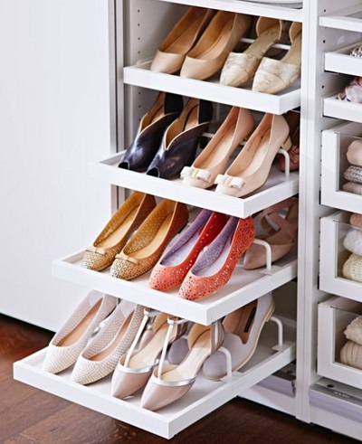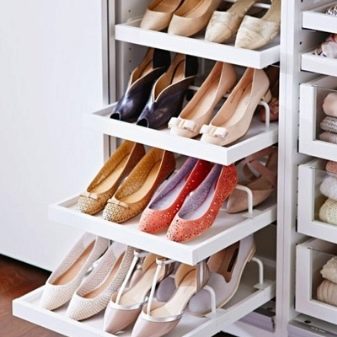 - La plupart des perfectionnistes stockent les chaussures dans des boîtes spéciales séparées de la même couleur, qui sont collées avec une photo du couple à l'intérieur.... Les boîtes peuvent être stockées aussi bien dans une armoire ouverte que dans une armoire fermée.
