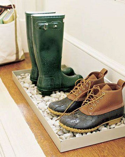 - Le moyen le plus simple de garder vos chaussures bien en vue est plateau ou palette, qui est placé près de la porte d'entrée. Sur demande, les palettes sont remplies de pierres ou d'autres charges résistantes à l'humidité. L'option la plus budgétaire est une palette en plastique. Vous pouvez y mettre vos chaussures juste après votre retour à la maison.