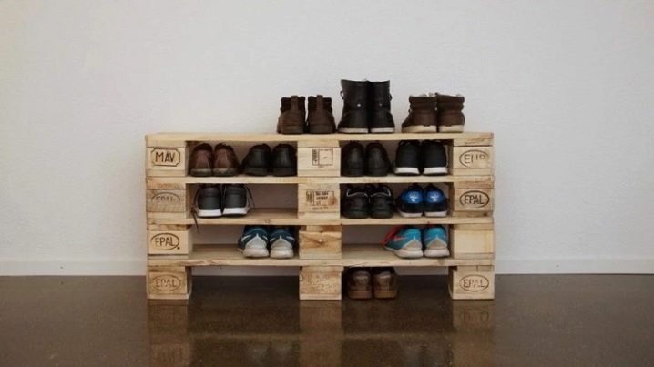 De nos jours, de nombreuses pièces intérieures sont fabriquées à partir de palettes de construction, notamment des lits, des canapés, des sièges, etc. La construction d'une étagère à chaussures à partir d'une palette de construction est si simple que vous pouvez fabriquer vous-même le produit. Une palette de construction standard doit être sciée en deux et les deux "étages" cousus ensemble. Si vous le souhaitez, vous pouvez peindre le produit fini dans une couleur vive. Le support prend peu de place, mais il est assez spacieux.