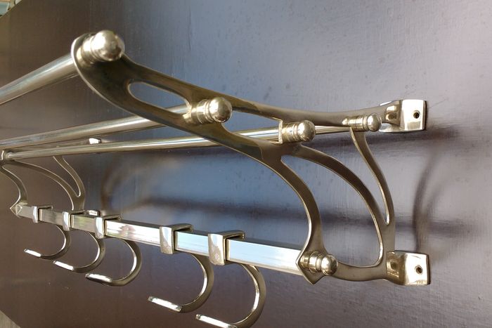 - Métallique. Pour la fabrication de crochets muraux, l'acier inoxydable et les métaux non ferreux sont principalement utilisés (les crochets sont en laiton, cuivre, bronze, aluminium). Les raccords métalliques sont durables, fiables et durables. Elle est capable de supporter de lourdes charges. Le principal inconvénient de ces modèles est considéré comme une fixation complexe: les produits sont installés sur des vis autotaraudeuses, pour lesquelles vous devrez percer un mur. Dans ce cas, vous ne pouvez pas vous passer d'un perforateur.