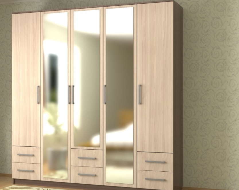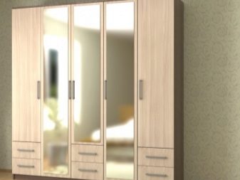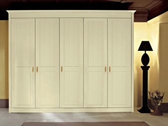 - Cinq feuilles les produits contiennent des étagères, des niches, des barres de suspension. Dans certaines versions, les armoires sont équipées de tiroirs similaires aux dressings. En d'autres termes, en plus des portes sur la face avant, il y a aussi 3-4 boîtes pour les choses.