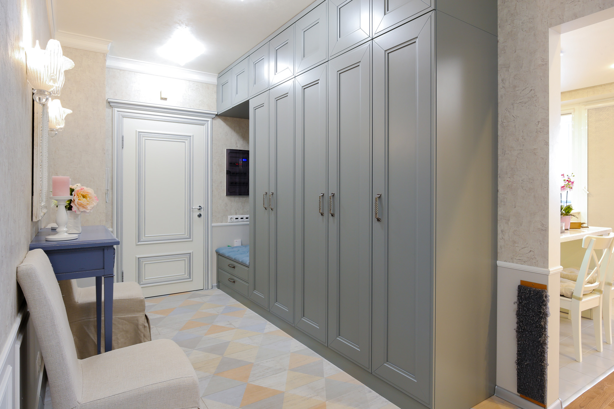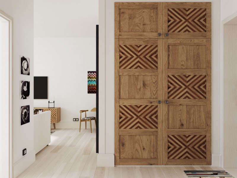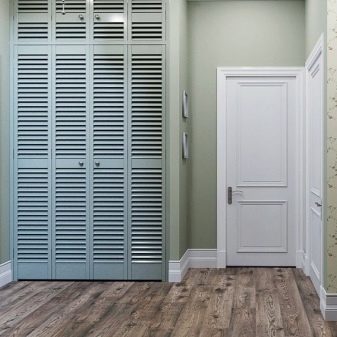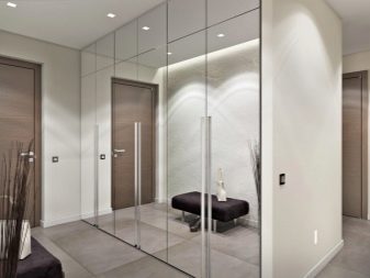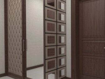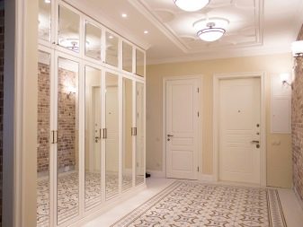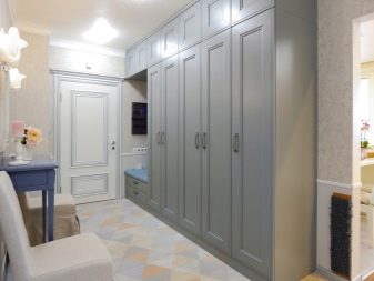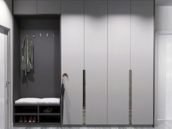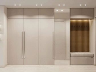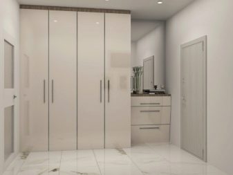 S'il y a une niche appropriée dans le couloir, alors un "ouvre-porte" intégré s'y adaptera parfaitement, qui aura fière allure comme un tout avec le mur, sans perturber la perception de toute la pièce dans son ensemble. La profondeur et le remplissage du meuble seront déterminés par les dimensions de la niche.