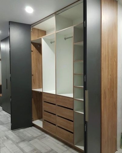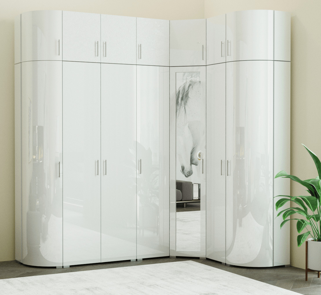 Version d'angle de l'armoire pivotante dans le couloir. Contient des tablettes latérales pratiques et un miroir pour corriger l'impression spatiale.