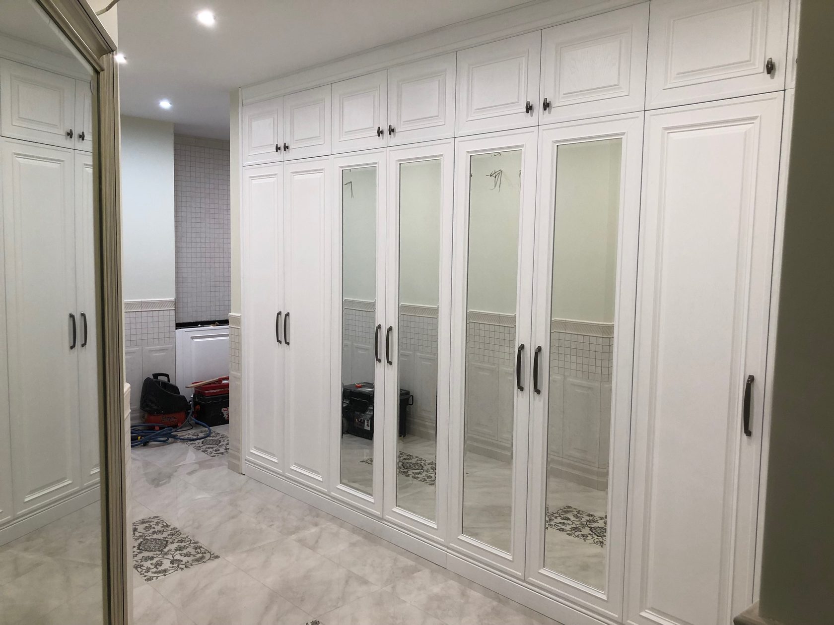 Grande penderie dans un couloir spacieux, option coin. Sur le côté se trouve un cintre miniature pratique pour ranger les vêtements mouillés. Combinaison parfaite de miroirs et de surfaces brillantes de portes d'armoires.