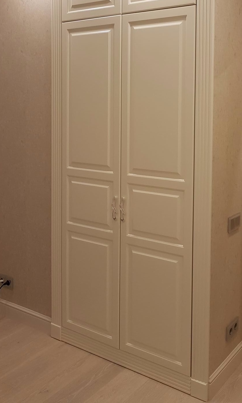 Armoire sur mesure à charnière. Des portes d'armoires blanches brillantes et un miroir agrandissent visuellement l'espace de la pièce.
