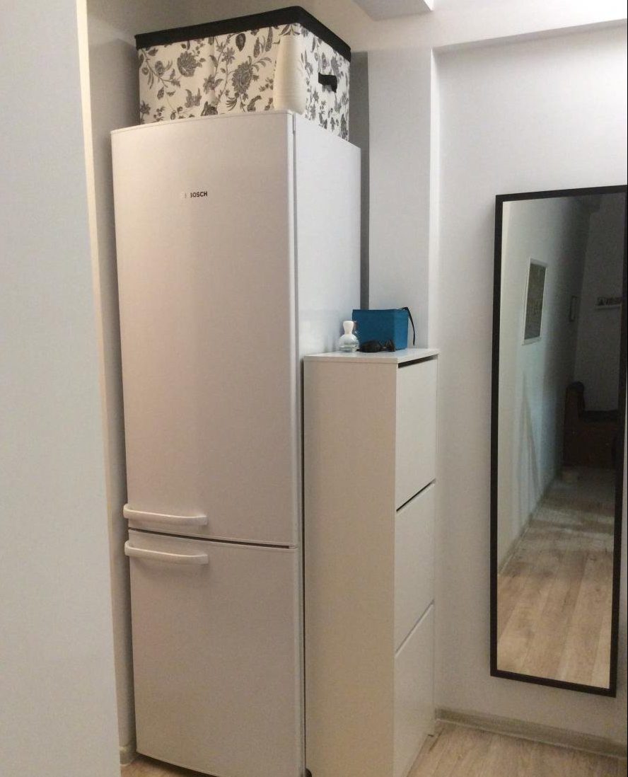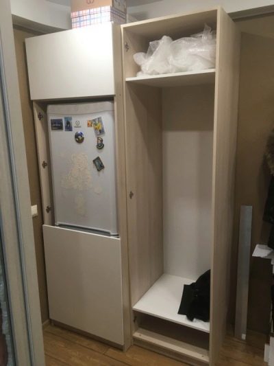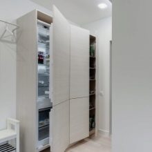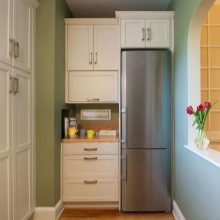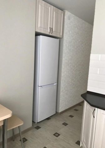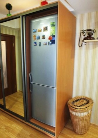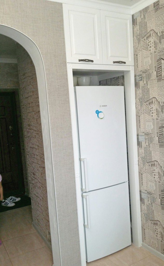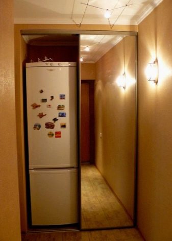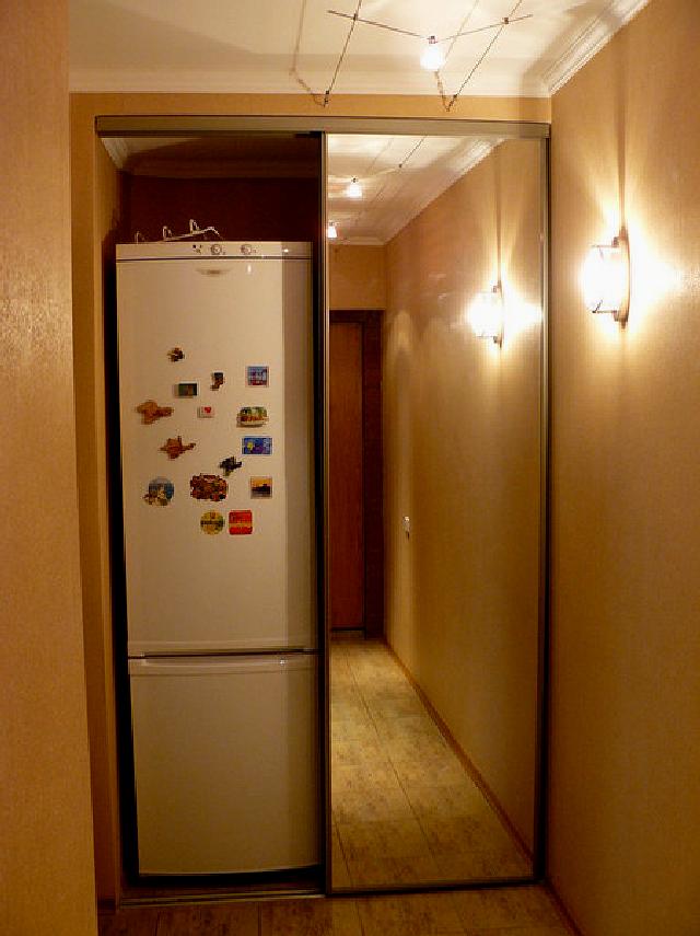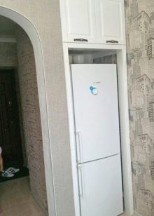 Derrière un petit placard. L'armoire peut partiellement - par exemple, à moitié - couvrir le réfrigérateur. Il peut y avoir un miroir à côté de l'armoire. Le meuble est choisi en blanc en combinaison avec les murs du couloir.