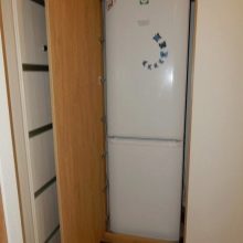 Dans les "Khrouchtchev" les couloirs sont assez étroits à côté de la cuisine; il ne sera possible d'y placer un réfrigérateur que près de l'entrée de l'appartement, où le couloir a une forme presque carrée. Si possible, sortez les autres articles ménagers de la cuisine pour faire de la place pour le réfrigérateur. Si un réfrigérateur à part entière dans la cuisine ne convient pas, utilisez un modèle intégré plus petit. Le fait est que la cuisine est séparée du couloir par un passage extrêmement étroit dans lequel il serait impossible de placer un réfrigérateur. Le couloir est situé assez loin - la commodité de la cuisine en souffrira de toute façon. Une niche dans le couloir ou le placard est considérée comme un grand succès pour une telle solution: la possibilité d'y placer un réfrigérateur dépend de la version spécifique du "Khrouchtchev", dont il existe au moins 6.