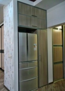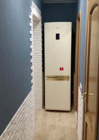 Un réfrigérateur est une chose intégrée ou autonome. Il ne se soucie pas de savoir où se tenir - tant qu'il y a une ventilation suffisante pour son fonctionnement normal. Il est encastré ou caché dans une armoire, décoré pour tout style de décoration de couloir.