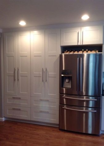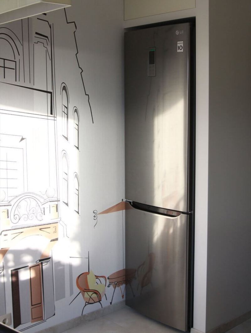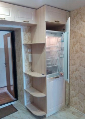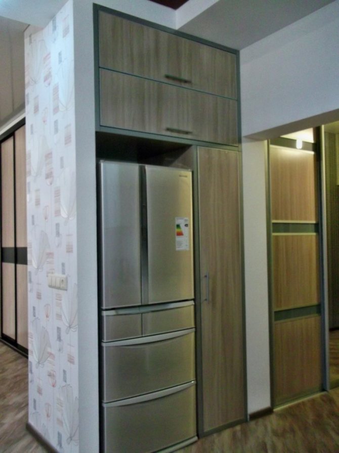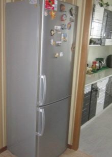 Dans les nouveaux bâtiments, la possibilité de placer un réfrigérateur à distance de marche de la cuisine est presque toujours présente. Il peut être caché à la fois dans une armoire assez spacieuse et laissé à la vue de tous, décorant ce meuble pour qu'il s'harmonise avec les murs, à côté de l'un desquels il a été placé.