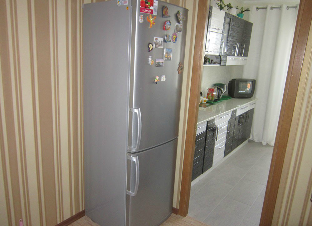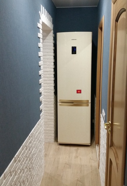 - La face arrière est à la porte intérieure, la face avant est à l'entrée de la cuisine. Les modèles de réfrigérateurs modernes n'ont pas de moteurs exposés tout en bas de la partie arrière pour l'affichage, ce qui permet de faire pivoter l'unité vers la porte d'entrée de chaque côté. Cette option convient lorsque le couloir n'est pas trop grand, mais il est nécessaire d'y placer le réfrigérateur, car il n'y a pas assez d'espace dans la cuisine.