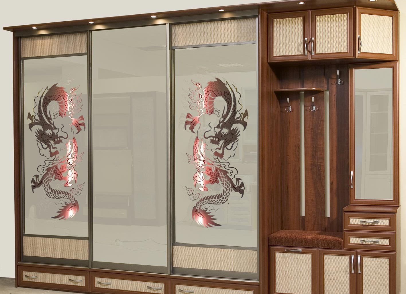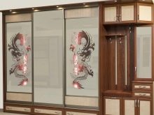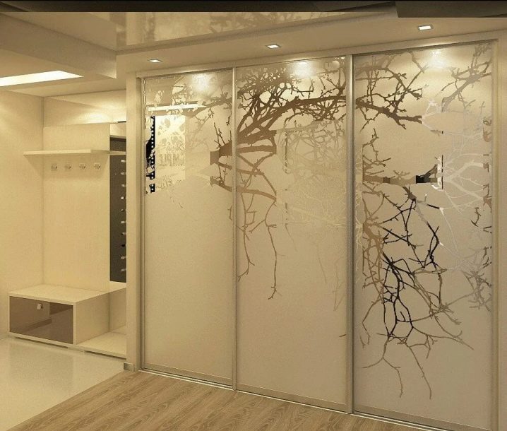Les portes des armoires sont en verre trempé résistant aux chocs. Il est difficile de les casser, mais si cela se produit, le verre se fissure avec une toile d'araignée et reste sur le film, ne donnant pas d'éclats tranchants. La surface des structures est brillante, mate, colorée, combinée. Le verre peut contenir un film avec une image, mais dans les versions plus chères, l'image est appliquée par sablage.