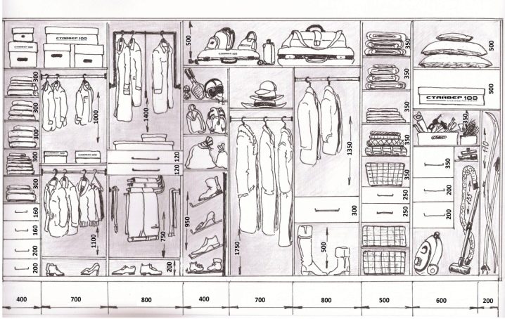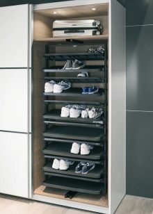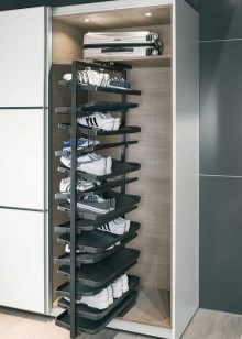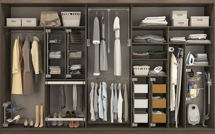 Des compartiments avec étagères peuvent alterner avec des tiroirs. Des étagères sont nécessaires pour les chapeaux, les sacs, les vêtements. Des paniers et des boîtes avec des chaussures et d'autres garnitures y sont placés. Echarpes, gants, chaussures et produits d'entretien des vêtements sont rangés dans les cartons.