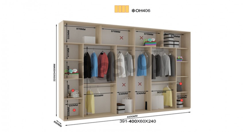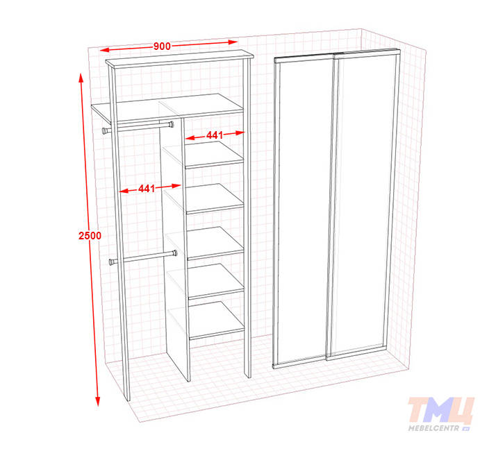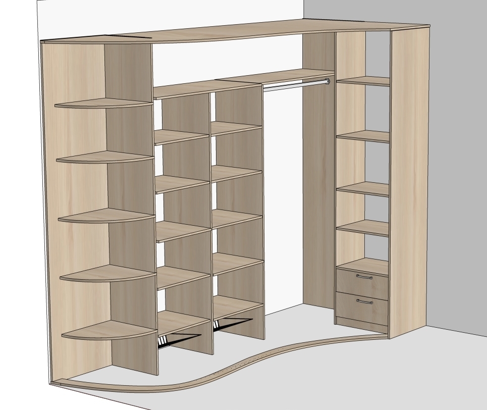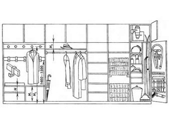 Les rails pour les cintres ne sont pas installés horizontalement, mais perpendiculairement à l'armoire. En raison de leur petite taille, les tiges sont souvent montées par paires, à la même hauteur, ou l'une d'elles est élevée jusqu'au plafond, et un pantographe est utilisé pour le fonctionnement. Les modèles d'une profondeur de 60 cm peuvent être dispensés d'une barre horizontale, mais à la demande des propriétaires, ils peuvent être équipés d'un support perpendiculaire.
