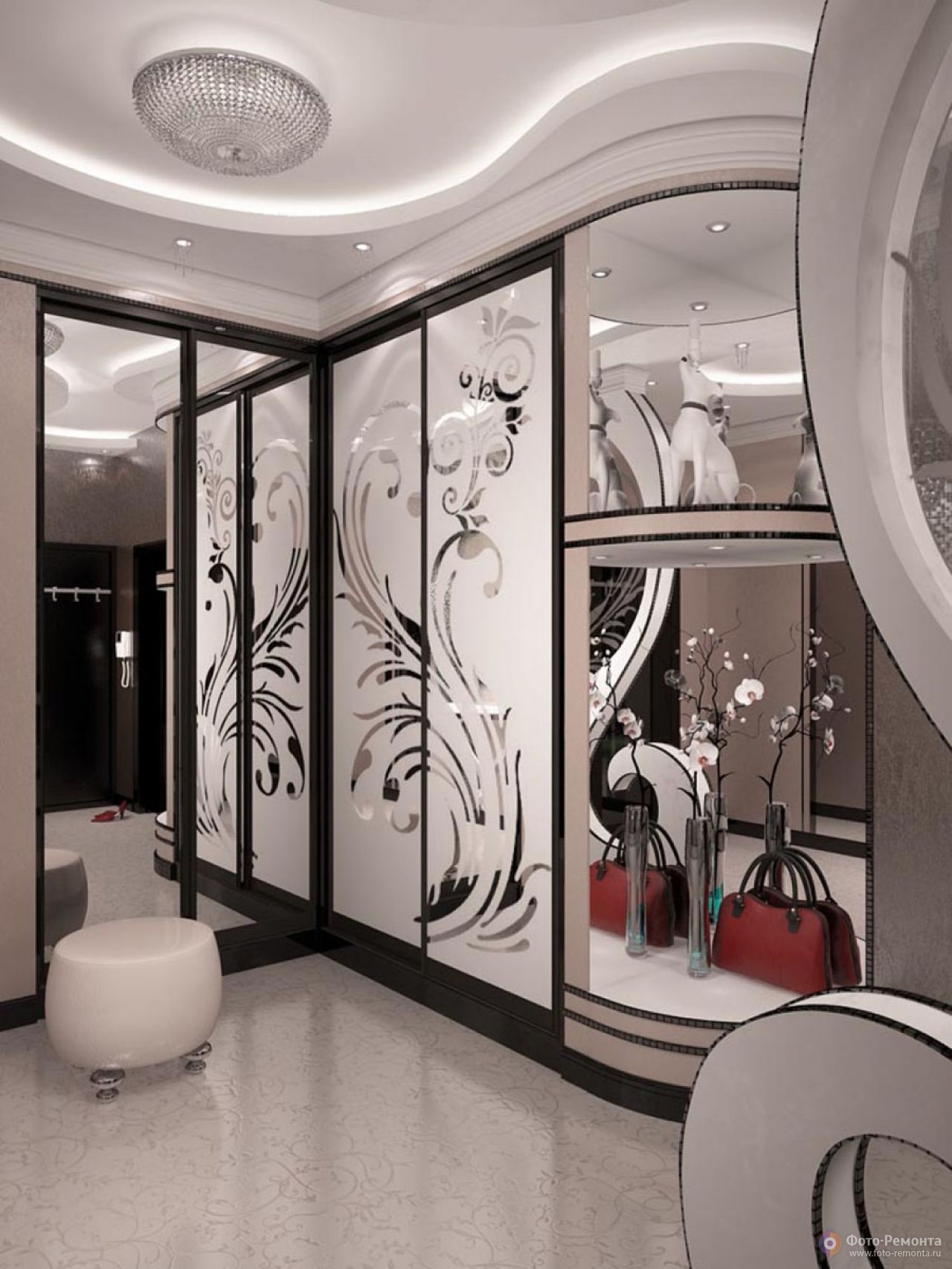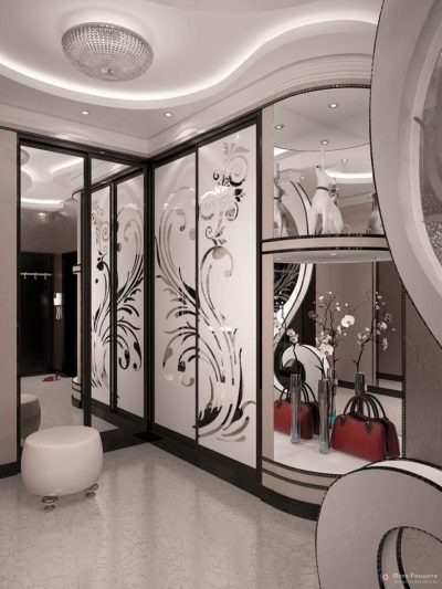 Le couloir se reflète dans les portes en miroir, et à partir de là, il semble deux fois plus grand. Si vous placez au moins une porte en miroir dans le placard, sa fonctionnalité augmentera et vous n'aurez plus besoin de chercher une place pour un miroir mural. Les dessins réalisés de différentes manières sont magnifiques sur des surfaces réfléchissantes et mates.